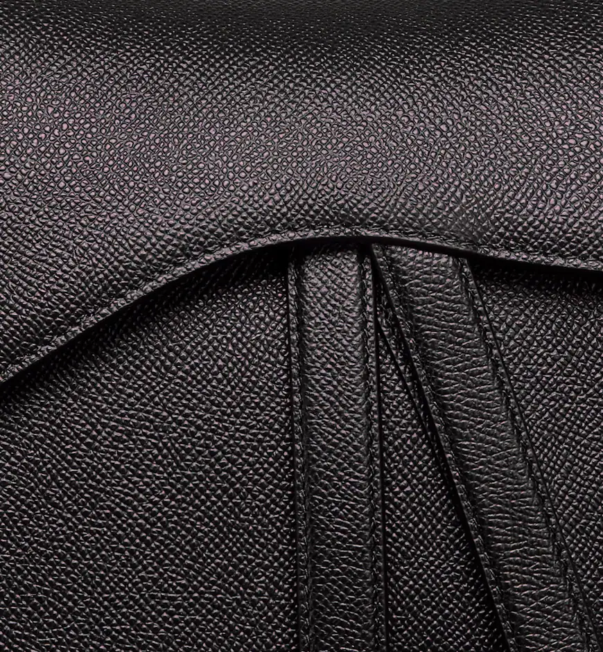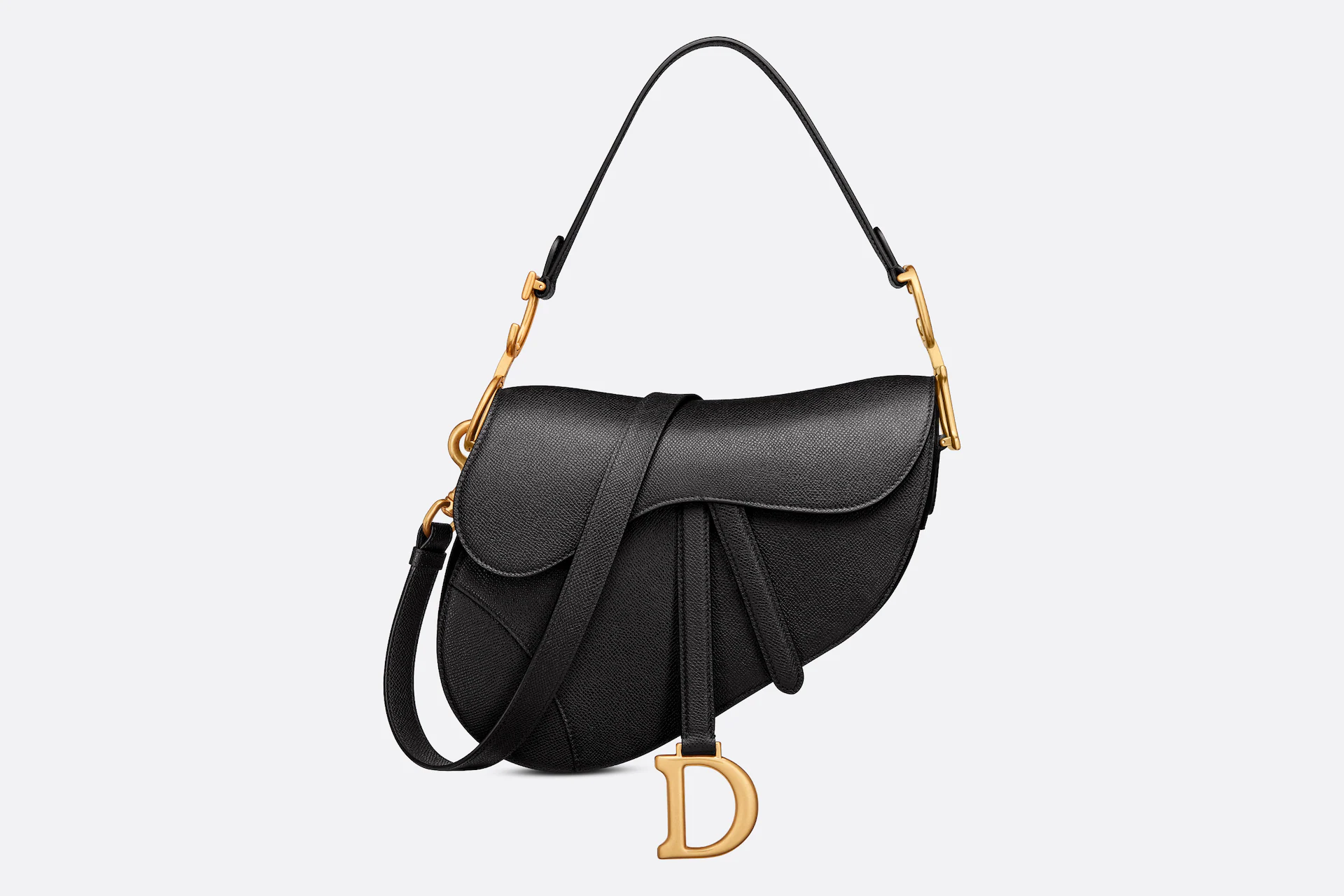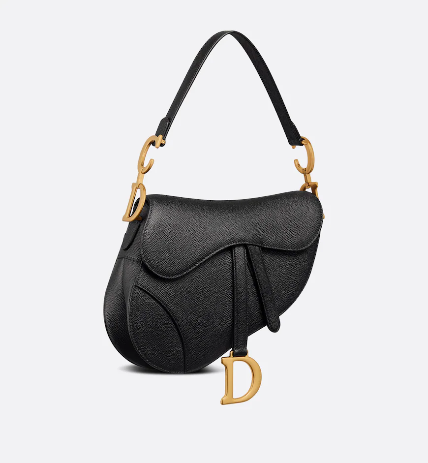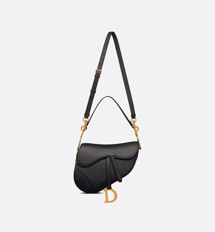 Maria Grazia Chiuri brings a fresh update to the iconic Saddle bag. Crafted in black grained calfskin, the legendary design features a Saddle flap with a D stirrup clasp on a magnetic strap, as well as an antique gold-finish metal CD signature on either side of the strap. Equipped with a thin, adjustable and removable shoulder strap, the Saddle bag may be carried by hand, worn over the shoulder or crossbody.