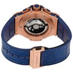Hublot Big Bang Gold Blue 44mm watch, Polished and Satin-finished 18kt Rose Gold case, Reference 301.PX.7180.LR. Case center (edge) lateral blue inserts. This model has Blue Sunray Satin-finished dial with applied brushed finished 18kt Rose Gold “applique” style index hour markers with luminous fill. Brushed finished 18kt Rose Gold minute and hour hands with luminous filled tips and skeletonized bottoms. Gold printed minute track with 5-minute Arabic numerals intervals on flat black rim on the outer edge of the dial. Date window located at the 4 and 5o’clock position. Small running seconds sub-dial hand located at the 9 o’clock position. Chronograph stopwatch functions: large red central seconds counter with the “H” logo as a counter-weight; 30-minute sub-dial counter located at the 3 o’clock position; 12-hour sub-dial counter located at the 6 o’clock position. The chronograph is adjusted using 18kt Rose Gold rectangulars buttons. 18kt Rose Gold Crown and chronograph buttons have blue rubber centers/inserts. The dial closed by a Scratch-resistant Sapphire Crystal with Anti-reflective Treatment. Of Sapphire Crystal made transparent case back. The watch is equipped fixed bezel of vertical Satin-finished 18kt Rose Gold and secured 6 immediately recognizable Hublots signature “H” screws style of Titanium. The watch is HUB4100 Self-winding Chronograph Movement, contains 28 Jewels and has an approximate power reserve of 42 hours. This model presented on a Black Rubber with a stiched blue (alligator) leather top Strap with Black-plated Stainless Steel and 18K Rose Gold Deployant Buckle Clasp. The water resistance is up to 100m/330ft (10 ATM).