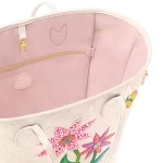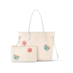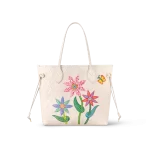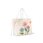 The LVxYK Neverfull MM gets a feminine crafted touch with the Flower theme of the Louis Vuitton x Yayoi Kusama collection. Flowers were a major part of the artist’s childhood in Japan. where her parents ran a plant nursery. and later became a prominent theme in her work. For this user-friendly bag. three colorful blossoms are depicted in leather marquetry on quartz white Monogram Empreinte cowhide. An ode to art and craftsmanship.