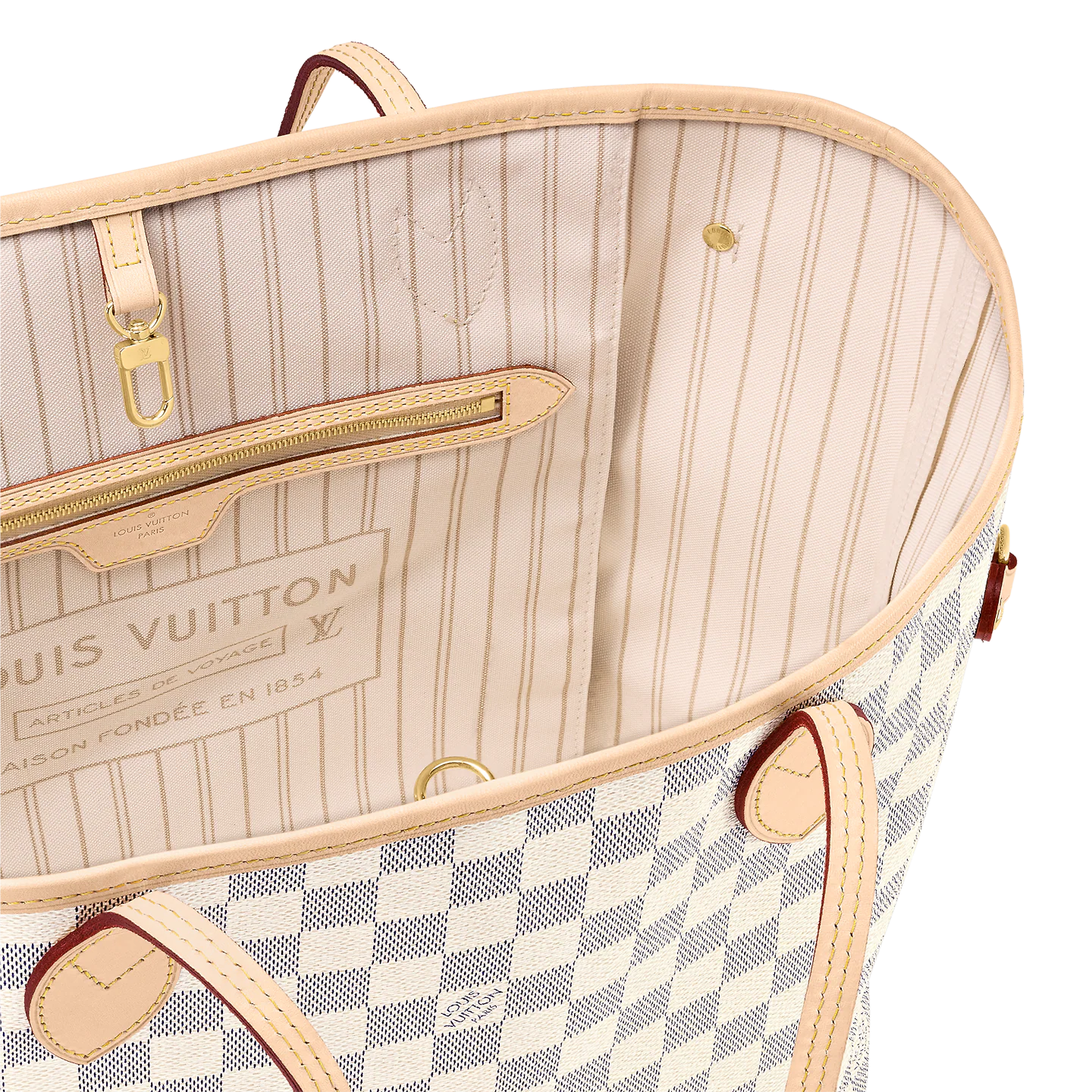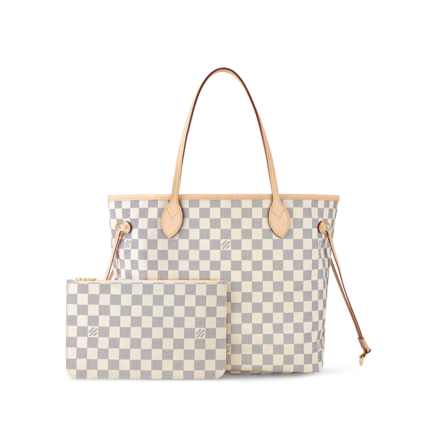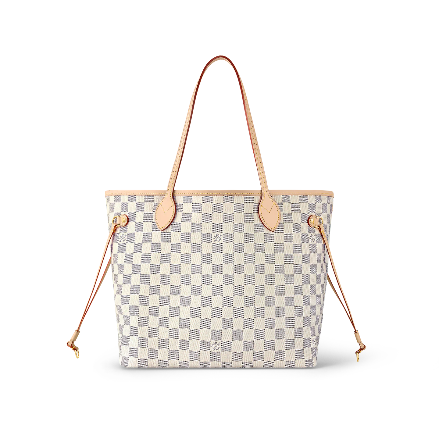The Neverfull MM tote unites timeless design with heritage details. Made from fresh Damier Azur canvas with natural cowhide trim. it is roomy yet not bulky. with side laces that cinch for a sleek allure or loosen for a casual look. The slim leather handles slip easily over the shoulder or arm. Lined in colorful textile. it features a removable pouch which can be used as a clutch or an extra pocket.