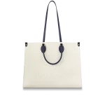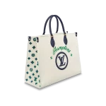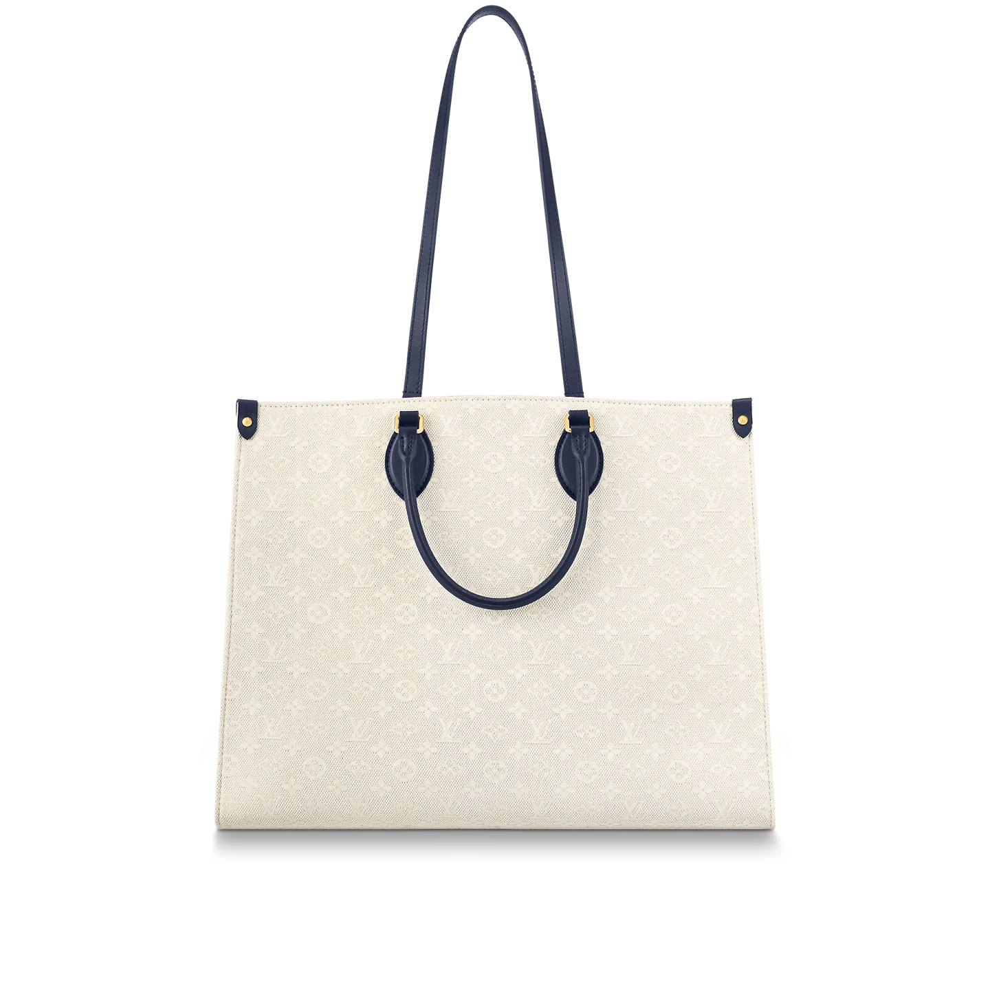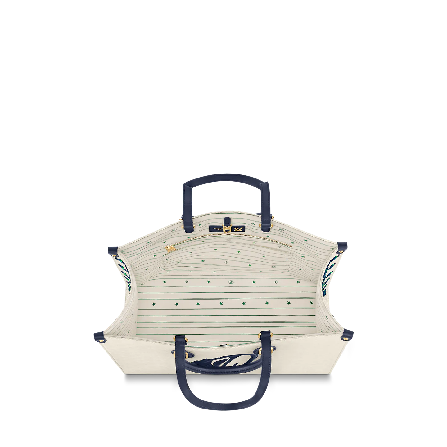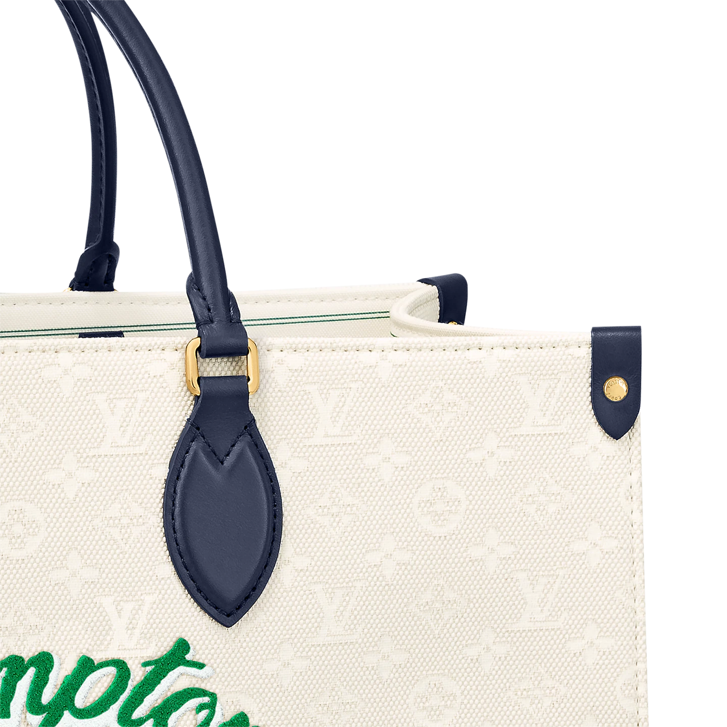 Emblazoned with the name of a favorite holiday destination. this Hamptons edition of the OnTheGo GM tote is the ideal companion for summer getaways. Made from tone-on-tone Monogram jacquard canvas enhanced with colorful tufted embroidery and an LV Circle emblem. it is fitted with contrasting leather handles and long shoulder straps for a range of chic carry styles.