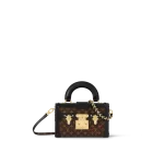 Nicolas Ghesquière brings a retro vibe to the Petite Malle Capitale handbag with a new top handle, making it even more versatile. Like its predecessor, the revisited shape is fashioned from Monogram canvas, with black trim and a gold-color S-lock, decorative studs and rivets. The removable braided chain brings a feminine touch to this suitcase-inspired city bag.