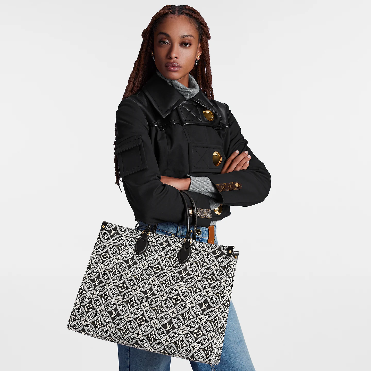 Nicolas Ghesqui??re brings his new Jacquard Since 1854 textile onto the OnTheGo GM tote. This woven textile is inspired by vintage wallpaper patterns and features Monogram Flowers and the number 1854. the year of the House’s founding. With two sets of handles. long and short. and a spacious interior. this is a versatile everyday bag.