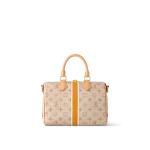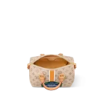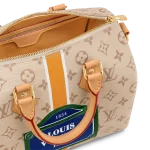 The Speedy Bandoulière 25’s emblematic shape is made from beige Monopaname canvas with a central vertical strip in white, ocher, and white, like those found on the House’s early trunks. In the center “Louis Vuitton Paris” in bold white typeface on a solid blue background is framed in green. Just like a typical Parisian street-sign.