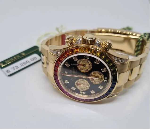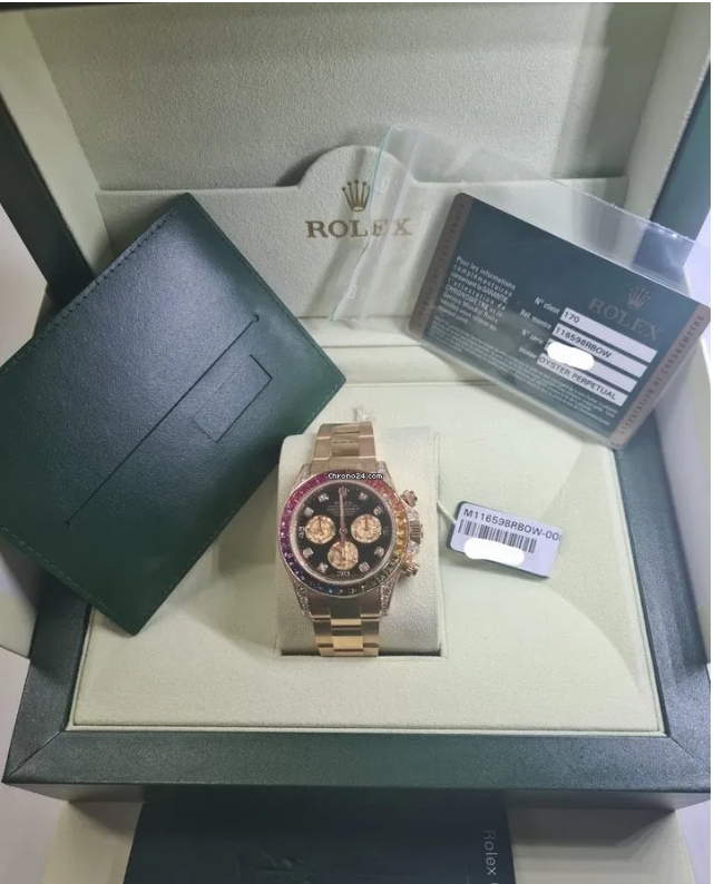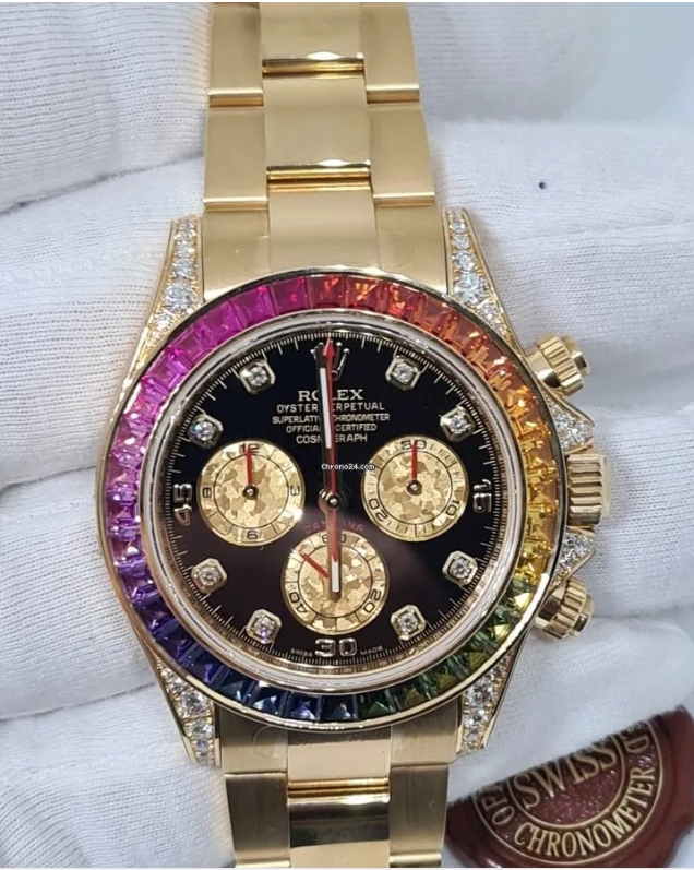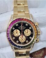 Rolex Daytona, Black dial, Diamond Bezel, Oyster bracelet, Yellow gold Watch 116598 RBOW. 40mm 18K yellow gold case set with 56 diamonds, fixed bezel set with 36 rainbow-colored baguette sapphires, screw-down push buttons, black dial with gold crystal sub-dials, 8 diamond hour markers, and Oysterlock bracelet.