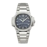 Patek Philippe Nautilus Blue Tinted Mother Of Pearl Dial Automatic Ladies Diamond Watch 7018/1A-010. Stainless steel case with a stainless steel bracelet. Fixed bezel. Blue tinted mother of pearl dial with silver-tone hands and index- Arabic at the 12 o’ clock hour markers. Dial Type: Analog. Luminescent hands and markers. Date display at the 6 o’clock position. Automatic movement. Caliber 324 s c engine. Scratch resistant sapphire crystal. Skeleton transparent exhibition see through case back. Case diameter: 33.6 mm. Cushion case shape. Fold over with safety clasp. Water resistant at 60 meters / 200 feet. Functions: date, hour, minute, second. Additional Info: bezel set with 50 diamonds (~0.71 ct). Luxury watch style.