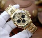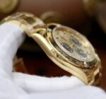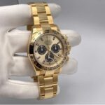 An exceptional timepiece, the Rolex Daytona 116508 remains to be a sought-after Rolex model. What can one not appreciate from this luxury watch? It has a polished 18K yellow gold case measuring 40mm in diameter. It has a matching yellow gold bezel with a black tachymeter scale, a yellow gold crown, and a yellow gold bracelet. The champagne dial complements the yellow gold’s warm glow. On the dial are three black chronograph sub-dials, polished yellow gold hands with luminous fill, and applied blackened index hour markers also with luminous fill. Beating inside is the Rolex in-house caliber 4130 with 44 jewels and 72 hours of power reserve. This pre-owned Rolex Cosmograph Daytona 18K Yellow Gold Champagne Dial Watch 116508 comes with papers and the manufacturer’s box.