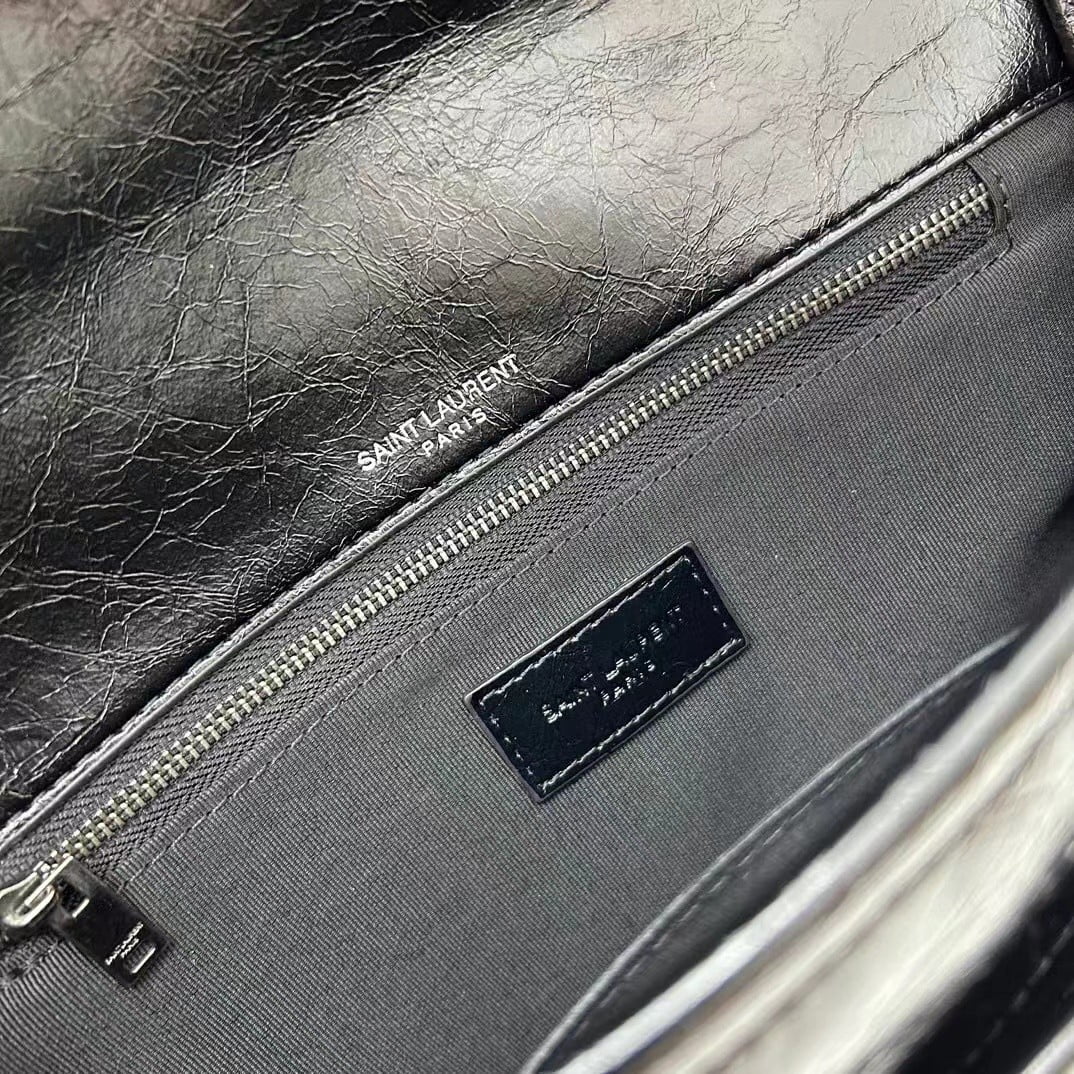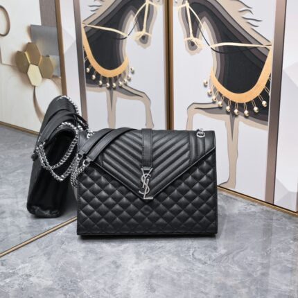LAURENT front clamshell bag with real leather-covered YSL trim, chain and leather multi-purpose shoulder strap, center compartment and open back pocket. Size 28CM imported leather dual-purpose chain shoulder strap 1 center compartment, 1 inner bag, 1 zipper pocket, 1 open progen, 1 flip bottom pocket
